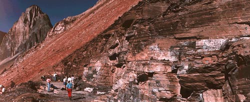 This is a picture of the Burgess Shale. It's a quarry containing large numbers of fossils from the Cambrian Period and dates to around 540 million years old. The quarry is located in southern British Columbia in Yoho National Park, a short distance from the town of Field in the Canadian Rockies. It is located about 2300 meters elevation on Fossil Ridge which runs from Wapta Mountain to Mount Field. It's about a three hour hike from Field over rugged trails. It is a holy place. Photo copyright Andrew Macrae (1995)